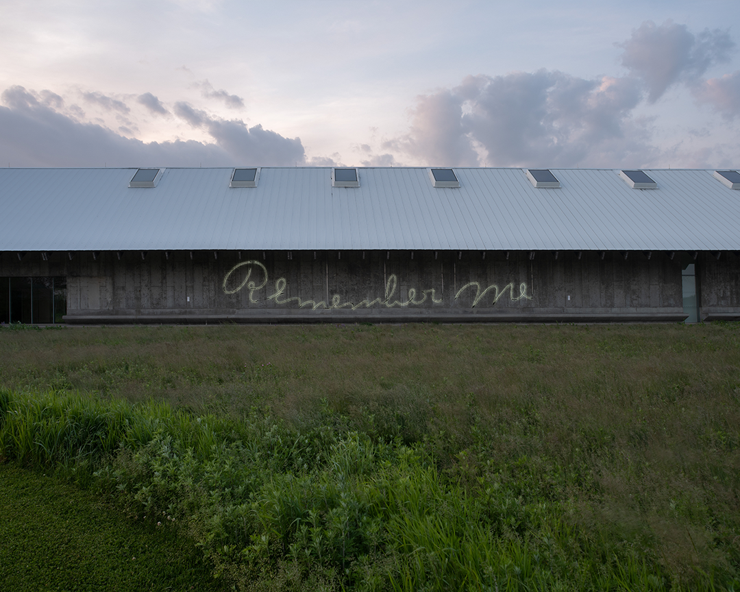 © Hank Willis Thomas, Remember Me, 2022. Installation view, Parrish Art Museum. White neon with black painted front, 95 x 624 1/2 inches. Courtesy the Artist and Jack Shainman Gallery, New York. Photo Credit: Gary Mamay