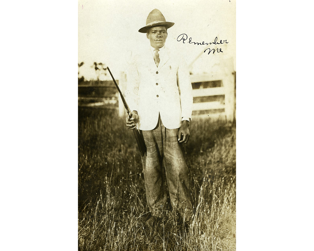 Installed on the south-facing façade of the Museum is the 55-foot neon Remember Me (2022) by Hank Willis Thomas (American, 1976)—the first work presented as part of the exhibition Another Justice: US Is Them. The source material for Remember Me was a vintage postcard the artist discovered from the Amistad Center of Art and Culture at the Wadsworth Atheneum Museum of Art in Connecticut. On one side was a photo of a young Black man in a jacket and tie, holding a rifle, and wearing a hat associated with Buffalo Soldiers—the Black cavalry regiments formed by the U.S. Army in 1866. On the other side were the handwritten words, “Remember me.” With this work, Thomas honors the many individuals who actively participate in society, but who are not often recognized or remembered.