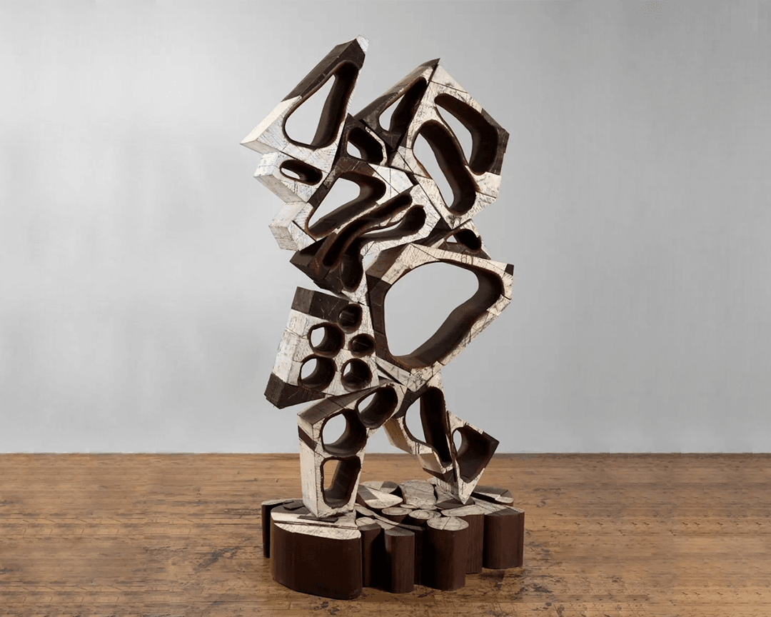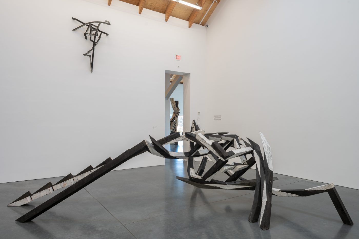 Sculpture No. 4, 1991. Poplar, oil, pipe, lamp black. Various dimensions. Courtesy of the artist; Crosswalk 1, 1992. Woodblock on Kozo paper, 108 x 192. Courtesy the artist. Photo credit: Gary Mamay||Behind the Cross, 1982. Plaster, wood, ink, 74 x 44 x 21. Addison gallery of America Art, Phillips Academy. Nemo, 1983. Wood, plaster, ink; 66 x 216 x 140. Courtesy the Artist. Photo credit: Gary Mamay||Mel Kendrick (American, born 1949) Installation view. Photo credit: Gary Mamay||Sculpture No. 3, 1991; Sculpture No. 2, 1991; Sculpture No. 4, 1991. Poplar, oil, pipe, lamp black. Various dimensions. Courtesy the Artist. Photo credit: Gary Mamay||Behind the Cross, 1982. Plaster, wood, ink, 74 x 44 x 21. Addison gallery of America Art, Phillips Academy. Nemo, 1983. Wood, plaster, ink; 66 x 216 x 140. Courtesy the Artist. Photo credit: Gary Mamay||Mel Kendrick (American, born 1949) Sculpture No. 3, 1991, Poplar, oil, lamp black, and pipe, 117 x 48 x 54 inches. Courtesy the Artist.||Mel Kendrick (American, born 1949) Nemo, 1983, Wood, plaster, and ink, 66 x 216 x 140 inches. Courtesy the Artist.||Mel Kendrick (American, born 1949), L450, 2019. Ebonized mahogany, 89 x 51 x 32 inches. Courtesy of the artist and David Nolan Gallery.