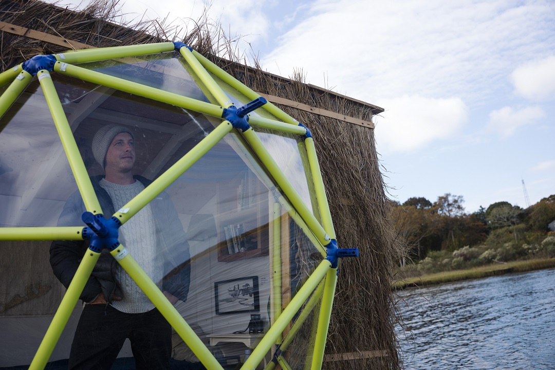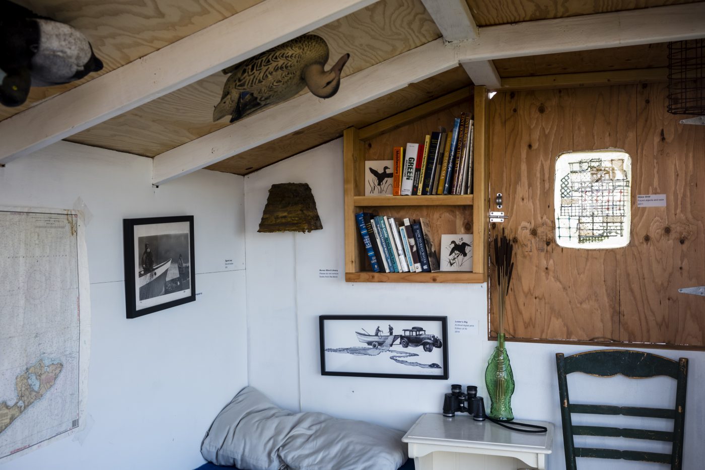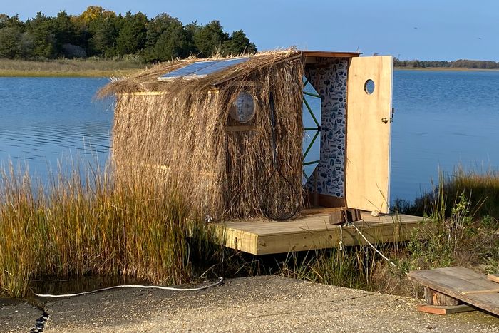For the 2020 Parrish Road Show, Scott Bluedorn created the Bonac Blind, a floating, mostly handmade dwelling constructed from a repurposed duck blind structure. The work draws attention to the drastic shortage of affordable housing in the Hamptons that has effected a mass exodus of working-class people, especially in the older local families native to East Hampton known as ‘Bonackers’ or ‘Bub’s’. This population, traditionally farmers, fishermen and hunters, is increasingly leaving the place they called home for generations for more affordable regions, causing a loss of town character, history, culture, and tradition. The Bonac Blind is a purposely tongue-in-cheek solution to housing by proposing that a duck blind, otherwise a camouflaged shed to hide in while hunting ducks, can be remade into a tiny and affordable floating house, complete with off-grid amenities such as solar power and a composting toilet. It speaks to the current popular trend of tiny homes that are sustainable, resilient, and adaptive as well as the desire to separate oneself (physically and hermetically) from the “wealthy elite” culture of the Hamptons. The Bonac Blind alludes to traditional Bonac culture of hunting, fishing, and austere living in the natural environment and will be fully functional and designed with found or donated objects and decorated with genuine artworks.