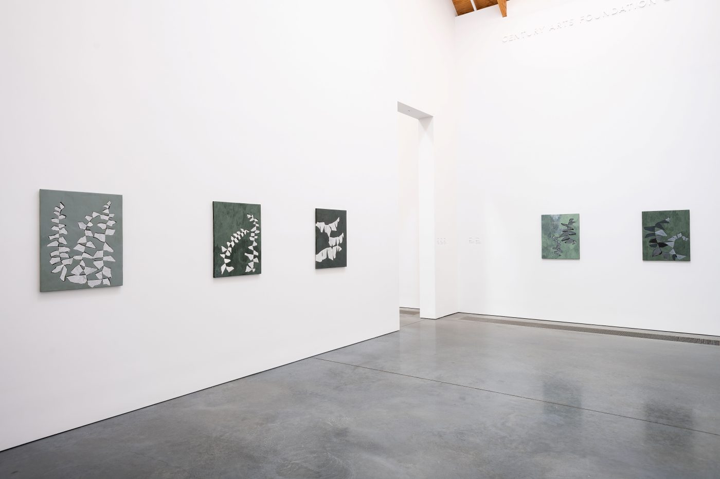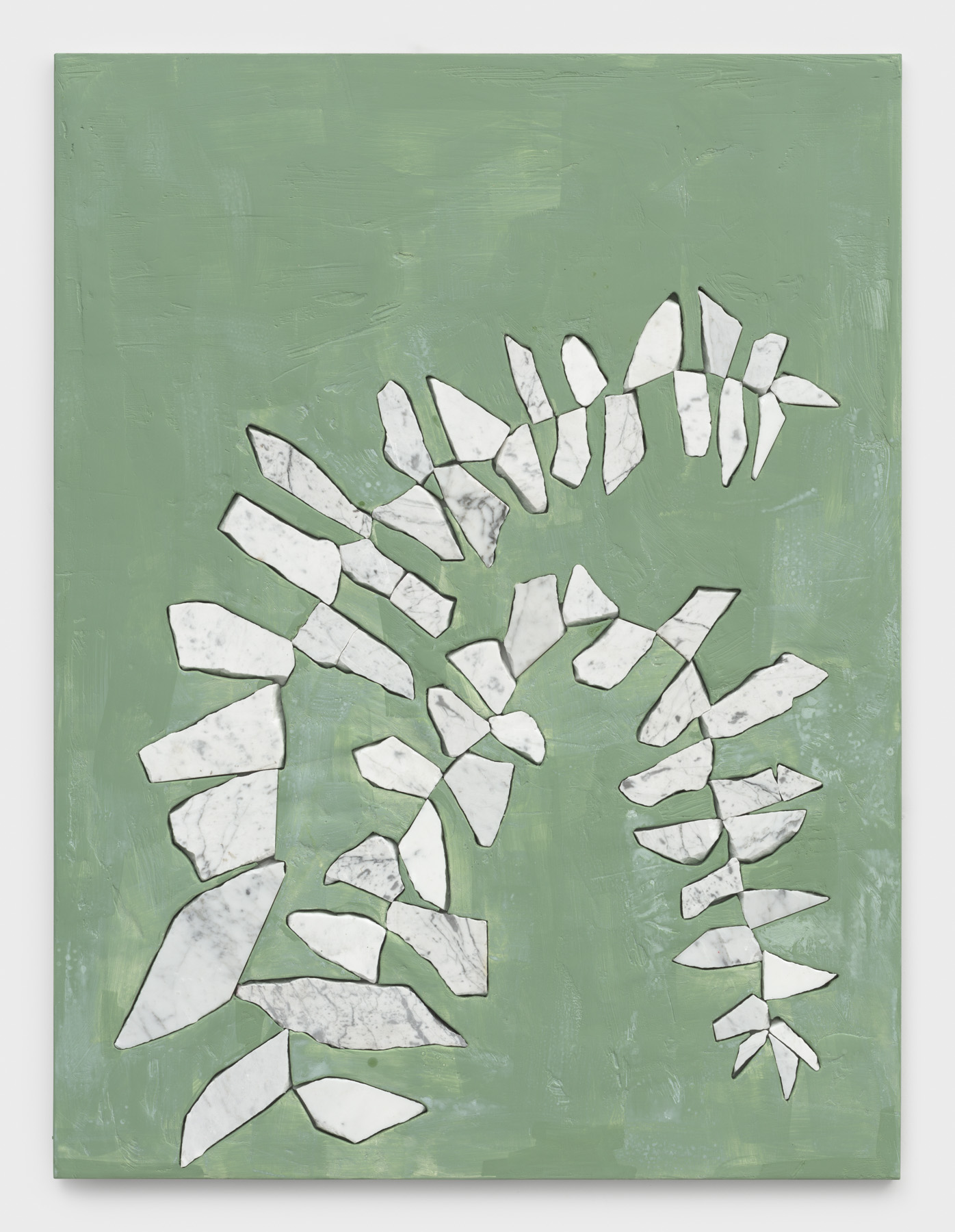In the exhibition’s first gallery, viewers are greeted by Fern Friend Grief Growth, a large-scale stone painting comprised of reclaimed marble set into painted plaster, tailor-fit to the architecture of the room. The work is faced by an artist-made marble bench that offers a direct tactile experience with the material and a contemplative atmosphere, inviting a cinematic view.